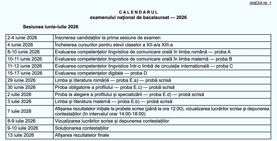 Calendarul examenului național de Bacalaureat 2026 – Sesiunea iunie-iulie 2026